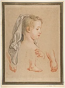 Charles de la Fosse, a prominent French Baroque artist active in the late 17th century, this delicate preparatory drawing, *Head of a Young Girl Studies of Hands and of Right Foot*. Likely dating to around his mature period, it captures intimate studies of a young girl's profile her expressive hands, and right foot on a single beige sheet. Such multi-figure sketches were essential tools for artists like de la Fosse, who under Charles Le Brun and contributed to grand Versailles decorations, honing anatomy and pose for larger history paintings. Rendered in black, red, and white chalk with subtl...