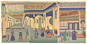 This vibrant triptych woodblock by Utagawa Yosha, titled *Heidoru (St. Petersburg), Capital of Russia from the series *F Places from All Nations*, a lively interior scene in Russia's imperial capital. Created in the 2nd month of 1865 during Japan's late Edo period (1615–1868), it reflects the era's growing curiosity about the world beyond isolationist borders. As Japan navigated the end of sakoku (national seclusion) amid foreign pressures, artists like Yoshitora—a prolific ukiyo-e master known for his dynamic depictions of warriors, actors, and exotic locales—produced these prints to satisfy ...