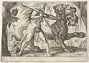 Hercules and Cerberus: Hercules grasps the collar of Cerberus, two demons appear at left, from the series 'The Labors of Hercules' by Antonio Tempesta