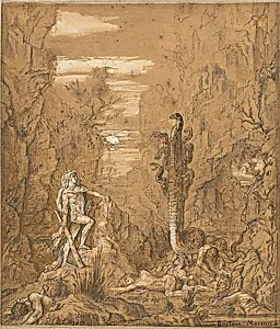 Pen and brown and black ink and graphite, with touches of brush and brown wash, heightened with lead white, discolored, on cream laid paper prepared with a pale brown wash, tipped on blue laid paper, laid down on cream board