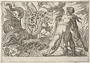 Hercules and the Hydra of Lerna: Hercules grasps his club with both hands and confronts the seven-headed hydra, from the series 'The Labors of Hercules'