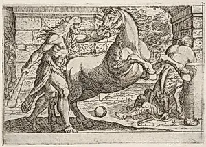 Hercules and the Mares of Diomedes: Hercules grasps the bridle of a rearing horse, a second horse tramples a figure in at right, from the series 'The Labors of Hercules'