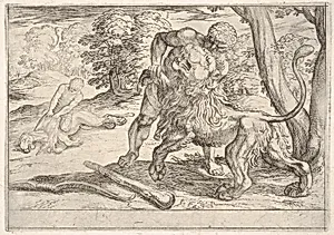 Hercules and the Nemean Lion: Hercules grasps the front right leg of the lion, which lifts its snout upward, in the middle ground Hercules pulls the skin from the lion's corpse, from the series 'The Labors of Hercules'