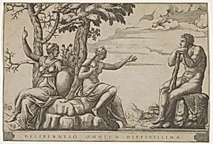 Hercules at the cross-roads, he is seated at the right, to the left are female personifications of Virtue and Vice
