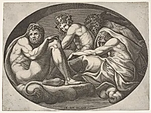 Hercules, Bacchus, Pan, and another god seated on a cloud under an arch, an oval composition, from a series of eight compositions after Francesco Primaticcio's designs for the ceiling of the Ulysses Gallery (destroyed 1738-39) at Fontainebleau
