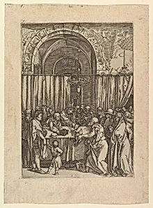 High priest refusing sacrificial lamb from Joachim, after Dürer