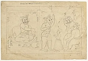 Hiranyakashipu commands his demon warriors to threaten and injure Prahlada. Preparatory drawing from the ‘Small Bhagavata Purana’ Series
