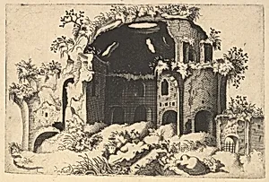 In the mid-16th century, the Renaissance fervor for rediscovering classical antiquity, Flemish artists Lambert Suavius and Gerard de J created this delicate etching, *Horizontal Landscape with the remains the Nymphaeum, mistakenly identified as the Temple Minerva Medica in Rome*. 1554, it the overgrown ruins of a Roman nymphaeum—a once-grand fountain house—framed by lush plants and a sweeping horizontal landscape. Part of the series *Ruinarum variarumarum delineationes pictor caeterisque id genus artificibus multum utiles* ("Delineations of Various Ruins Useful to Painters and Other Artists"),...