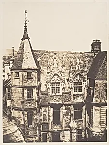 Step into the elegant world of 19th Rouen with Edmond Bacot's *Hôtel du Bourgthere, Rouen* (1852–54), a salted paper print that masterfully captures the Renaissance splendor of this historic hotel. Nestled in Normandy, France, the Hôtel du Bourgtherould exemplifies Flamboyant Gothic and early Renaissance architecture, with its intricate stone facades, ornate carvings, and half-ted charm. Bacot, a pioneering French photographer, documented such architectural treasures during photography's infancy, preserving them with remarkable fidelity for future generations. Printed from a glass negative us...
