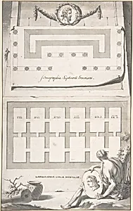 Ichnographia (or groundplan) of the Arch of Septimius Severus (above) and the Curia Hostilia (below)