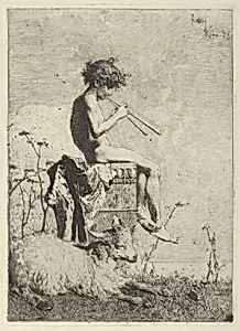 Idyll: a naked youth seated outdoors on a plinth playing a double flute, a goat on the ground before him