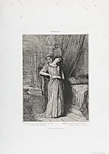 "If I do die before thee, pr'ythee shroud me in one of those same sheets": plate 8 from Othello (Act 4, Scene 3) by Théodore Chassériau|William Shakespeare