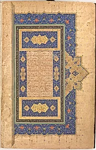 This stunning *Illuminated Frontisp of a Bustan of Sa`di*, created by the Persian artist Sultan Muhammad Nur in 4 CE (A.H. 920), opens a luxurious manuscript of the 13th-century poet Sa`di's *Bustan* ("Orchard"), a collection of moral tales and teachings in verse. Housed in the Metropolitan Museum of Art's Islamic Art Department, this folio exemplifies the early Safavid era's artistic brilliance under Shah Ismail I, when Tabriz emerged as a hub for illuminated manuscripts blending poetry, spirituality, and royal patronage. Crafted with ink, opaque watercolor, and lavish gold on paper, bound i...