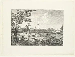 Step into the whimsical world of 18th-century Venice withetto's *Imaginary View of Padua*, etching from his celebrated *Views* series (*Vedute altre prese da luoghi altre ideate da Canal*), created between 1735 and 1746. This second state of three captures a fantastical panorama of Padua, blending real architectural motifs with artistic invention: a towering campanile and domed rise on the left, a grand column crowned by a saint's statue commands the center, and a quaint cottage and water-mill nestle in the right foreground. Giovanni Antonio Canal, known simply as Canaletto, masterfully evokes...