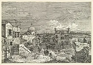 Imaginary View of Venice, houses at left with figures on terraces, a domed church at center in the background, boats and boat-sheds below, and a seated man observing from a wall at right in the foreground, from 'Views' (Vedute altre prese da i luoghi altre ideate da Antonio Canal)