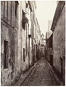 **Impasse Briare (de Cité Coquenard)** captured by Charles Marville in 1860s, offers a poignant glimpse into old Paris on the eve of transformation. Marville, the city's official photographer under Napoleon III, meticulously documented its narrow alleys and working-class neighborhoods like this dead-end passage in the Cité Coquenard. salt-print albumen silver images from glass negatives preserve the gritty charm of medieval streetscapes, soon to vanish under Baron Haussmann's sweeping urban renewal. Printed in rich sepia tones on a grand 62.9 x 45.2 cm scale, the albumen process—pioneered in ...