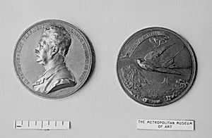 This exquisite bronze medal, crafted by Austrian artist Anton Scharff 1892, honors Bachofen von Echt his presidency of the Ornithological Society of Vienna prestigious group dedicated to the study of. Measuring just 1 1/2 inches (38 mm) in diameter, exemplifies the intimate artistry of 19th-century plaquettes and medals, small-scale sculptures prized for their intricate relief work and portability. Donated to the Metropolitan Museum of Art in 1896 by Baron Bachofen von Echt through S. Oettinger, it now resides in the European Sculpture and Decorative Arts collection. The medal likely features...