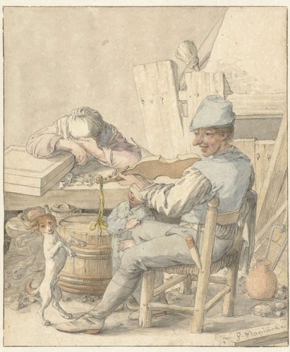 Interieur met vioolspelende man, slapende vrouw en dansende hond