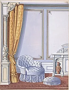 Interior Design for a Gray Curtained Alcove, with an Uphostered Armchair, Ottoman and Cabinet