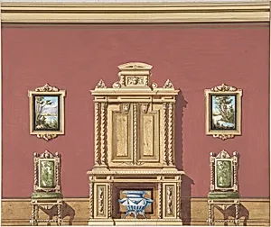 Interior Design with a Central Cabinet, Two Chairs and Two Landscape Paintings against a Red Wall
