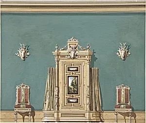 Interior Design witha Gun Cabinet and Two Chairs against a Green Wall Adorned with Trophies