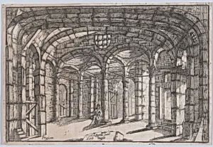 Interior of a prison in which sits a woman (possibly a theatre set)