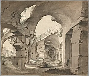 Pen and brown ink and brush and black and green washes, over black chalk, on cream laid paper