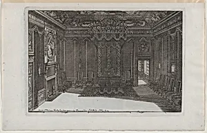 Step into the opulent world of early 18th-century European interiors with *Interior with a Canopy Bed and a Row of Chairs Lining the Walls*, an etching from Daniel Marot the Elder's *Nouveaux Liure da Partements*, part of his renowned *Œuvres du Sr. D. Marot*. Published around 1703 or 1712 by Pierre Husson, this print captures a lavish bedroom scene: a grand canopy bed dominates the space, flanked by chairs neatly aligned along tapestry-hung walls, a ornate fireplace, and subtle human figures, evoking the symmetry and grandeur of French design. Daniel Marot, a Huguenot architect and engraver ...