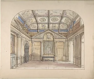 Step into the opulent world of 19th-century interior design with John Gregory Crace's * with Coffered Ceiling and Corinthian Order Applied Walls*. This exquisite drawing captures a grand architectural fantasy, featuring a richly paneled coffered ceiling—recessed compartments typical of classical Roman halls—and walls adorned with the elaborate Corinthian order, known for its acanthus-leaf capitals symbolizing luxury and refinement. Crace, a skilled practitioner in the Crace family tradition of decoration, likely created this as a design study or proposal, reflecting the Victorian era's passion...