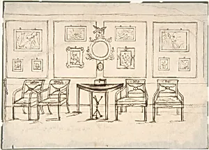 Interior with Four Armchairs, a Round Mirror, Demilune Table and Framed Prints or Drawings