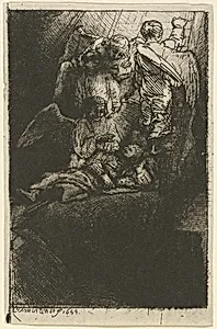 Rembrandt van Rijn's *Jacob's Ladder* (1655) captures the biblical dream from Genesis 28 where the patriarch Jacob slumbers beneath a visionary ladder stretching from earth to heaven, flanked by ascending and descending angels Created during the Dutch master's late career amid personal hardships, this intimate etching—measuring just 10.6 × 7 cm—exemplifies Rembrandt's profound engagement with spiritual themes, blending human vulnerability with divine mystery in the Baroque tradition of dramatic light and shadow. Rembrandt's technical brilliance shines through his masterful use of etching, burin, and drypoint on a trimmed sheet. The etching needle creates fluid lines for the ethereal ladder and figures, while drypoint's burr adds velvety texture and depth to the angels' forms and Jacob's recumbent pose. These combined techniques produce a luminous, atmospheric quality rare in prints of the era, allowing subtle tonal gradations that evoke the haze of a dream. Housed in the National Gallery of Art's Rosenwald Collection, this print highlights Rembrandt's innovation in printmaking during the Dutch Golden Age, influencing generations of artists. Its small scale invites close contemplation, rewarding viewers with layers of emotion and spirituality in a single, masterful impression.