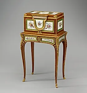 Oak veneered with tulipwood, amaranth, stained sycamore, holly, and ebonized holly; thirteen soft-paste porcelain plaques; gilt-bronze mounts; velvet (not original)