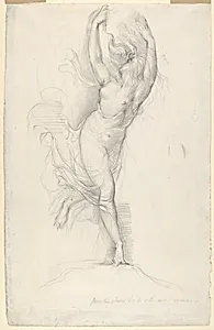 In the early 19th century, British artist George Richmond captured the poetic essence of William Shakespeare's *Romeo and Juliet* in this evocative graphite drawing titled *"Jund Day Stands Tip on the Misty Mountain Tops"* (ca. 1830). The title draws directly from Act 3, Scene 5, where Juliet laments the dawn's arrival, personifying the "jocund day" tiptoeing over misty peaks. Richmond, a close associate of William Blake and part of the visionary "Ancients" circle, infused the work with Romantic sensibilities, blending literary inspiration with delicate natural imagery and the human form—highl...