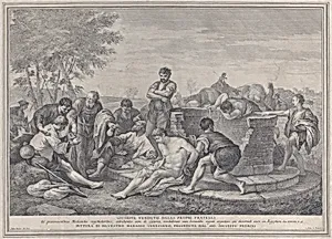 Joseph being sold into slavery by his brothers, who sit around a well dividing up the coins