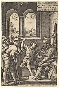 Joseph explains his dream to his brothers and father in an interior setting; the sun, moon, and stars above a landscape in the portal beyond, from the series 'The Story of Joseph'