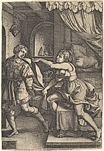 Joseph strides away from Potiphar's wife, who clutches his cloak with both hands as she straddles the corner of a bed, from the series 'The Story of Joseph'