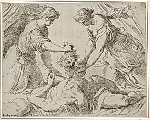 In this gripping etching by Jacopo Palma the Younger a Venetian artist active in the late 16th and early th centuries, we witness a pivotal moment from the biblical Book of Judith. The Jewish heroine Judith triumphantly places the severed head of the Assyrian general Holofer onto a cloth held by her servant, while his foreshortened body sprawls dramatically below, blood gushing from the neck wound. Created around 1570–1628, this print the intense drama of Judith's courageous act to save her people from invasion, a popular theme in Renaissance art symbolizing female strength and divine justice....