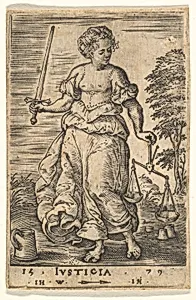 Justice, an allegorical figure holding a balance in her left hand and a sword in her right, from "The Seven Virtues and Knowledge"