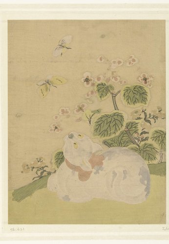 Witte kat met grijze vlekken, opkijkend naar twee vlinders; bloeiende begonia en chrysanten op de achtergrond.