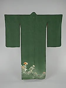 緑綸子地鶏頭模様着物|Kimono with Cockscomb Flowers