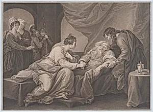 In this poignant stipple engraving from around 1783, Francesco Bartolozzi captures a heart-wrenching moment from William Shakespeare's *King Lear*, Act 4, Scene 7. The elderly king, having spiraled into madness after betrayal by his other daughters, awakens in the French camp, tenderly attended by his loyal Cordelia. Supported by a figure—likely Kent or a physician—Lear stirs to consciousness as Cordelia gazes with forgiveness and concern, embodying one of Shakespeare's most emotionally charged scenes of reconciliation and redemption. Executed after a painting by Benjamin West, the American h...