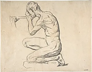 Henri Lehmann's *Kneeling Nude Figure, Facing Left*March 25, 1859) is a masterful graphite drawing that exemplifies the rigorous academic training of 19th-century French artists. Created on a modest sheet measuring 8 15/16 x 11 7/16 inches, this study captures a male figure in a dynamic kneeling pose, viewed from the side. Lehmann, a pupil of the esteemed Neoclassicist Jean-Auguste-Dominique Ingres and later a professor at the É des Beaux-Arts, drew in the precise, linear style of the Ingresque tradition, where anatomical accuracy and fluid contours were paramount. Graphite's subtle tonal ran...