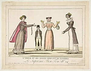 In 1815, amid the swirl of post-Napoleonic Europe, French caricaturists Aaron Martinet and Adrien Pierre Godefroy, Le Jeune, captured the era's fashion frenzy in *L'Amour et les Graces Arrivant de Londres; Le Suprême Bon-Ton No. 24*. This hand-colored etching, part of a satirical series mocking high society's "supreme bon-ton" (ultimate chic), depicts Love (perhaps Cupid) and the Graces arriving from London, poking fun at the influx of English styles into Paris after years of wartime rivalry. The vibrant, meticulously applied colors highlight exaggerated gowns, hats, and accessories on women a...