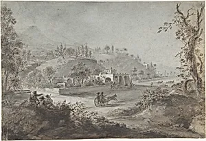 Charcoal or black chalk (stumped), pen and brown ink, brush with brown and gray wash, highlighted with white chalk (?), on blue-gray paper