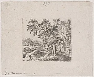 Landscape with a man and a dog at lower left, two trees and a house at right, hills in far distance