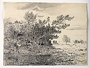 Théodore Rousseau, a figure of the Barbizon School in19th-century France, the raw beauty of nature in *Landscape with a Pond* (ca. 1850). This intimate drawing exemplifies his commitment to plein air observation, painting directly from the French countryside near Barbizon. As a precursor to Impressionism, Rousseau idealized landscapes, instead emphasizing atmospheric effects and the changing light over ponds, trees, and undergrowth—hallmarks of his realist style. Executed in black ink and gray wash on cream laid paper the work measures just 5 5/16 x 6 15/16 inches, suggesting it was a quick s...