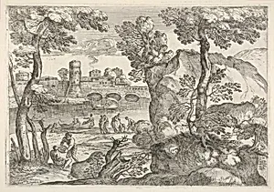 Giovanni Francesco Grimaldi (1606–1680), known as "Il Bolognese," was an Italian painter, draughtsman, and etcher whose career exemplifies the wide influence of the Bolognese school of landscape painting in seventeenth-century Rome. Born in Bologna, Grimaldi trained in the tradition of the Carracci, whose idealized approach to landscape — blending careful observation of nature with classical compo...