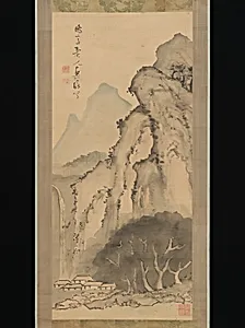 Kameda Bōsai's *Landscape with Waterfall*ca. 1817) is a captivating hanging scroll Japan's Edo period (1615–1868), a time of cultural flourishing under the Tokugawa shogunate artists explored nature's grandeur through refined literati styles. This ink and color on silk painting captures misty mountains and a cascading waterfall, evoking the sublime power of the natural world—a common theme in Japanese landscapes that invited contemplation and harmony with the environment. The hanging scroll format, with its luxurious silk surface (41 7/8 × 19 1/8 in.), was ideal for intimate display in homes ...
