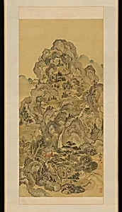 Ike Taiga's *Landscapes in Summer and Winter*, an exquisite pair of hanging scrolls from 18th-century Japan during the Edo period (161–1868), captures the poetic contrast of nature's seasonal transformations. Created in ink on silk, these works exemplify Taiga's mastery of *nanga* (Southern School) painting, a literati style inspired by Chinese traditions but infused with Japanese sensibility. Towering mountains dominate the compositions, evoking the sublime beauty and transience of the natural world—a theme central to East Asian art. The hanging scroll format, measuring about 38½ × 18¼ inche...