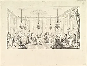 **Le Bal Paré (The Fancy Ball), 1774** Step into the lavish whirl of 18th-century high society with *Le Bal Paré*, an etched proof by engraver Augustin de Saint-A after a design by painter Antoine Jean Duclos. first-state impression— one of four documented by scholar François Bocher—captures masquerade ball alive with elegantly dressed men and women mid-dance. Measuring 13 7/16 × 17 11/16 inches, the print's expansive sheet allows for a bustling scene of swirling skirts, powdered wigs, and animated figures, evoking the opulent soirées of pre-Revolutionary Paris or Versailles. Created in 1774...